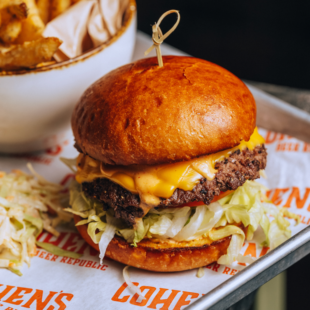 A 5 oz All-Canadian Beef Smash Patty, Cohen's Burger Sauce, American Cheese, Iceberg Lettuce, Tomato, and Dill Pickle served on a Brioche Bun.