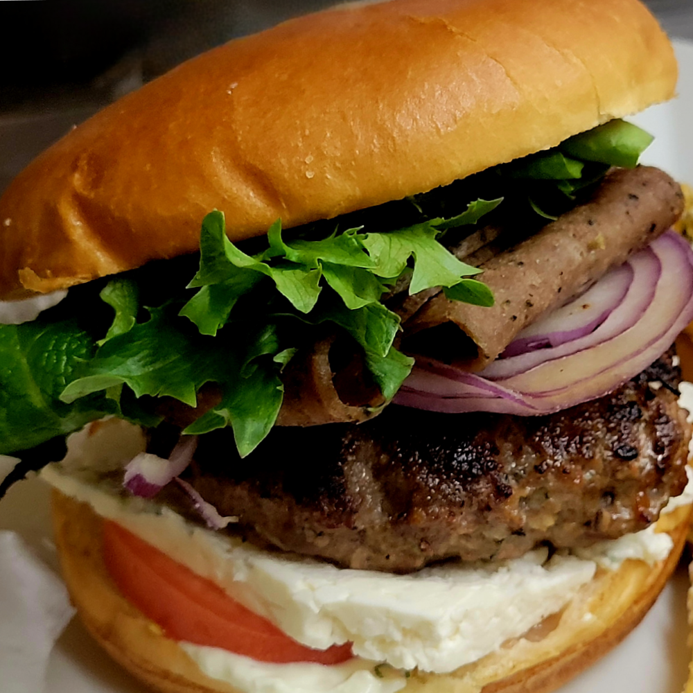 A Ground Chuck Patty, Greek Herbs, Gyro Meat, Feta Cheese, Red Onion, Tomato and House-Made Tzatziki Sauce served on a Classic Bun.